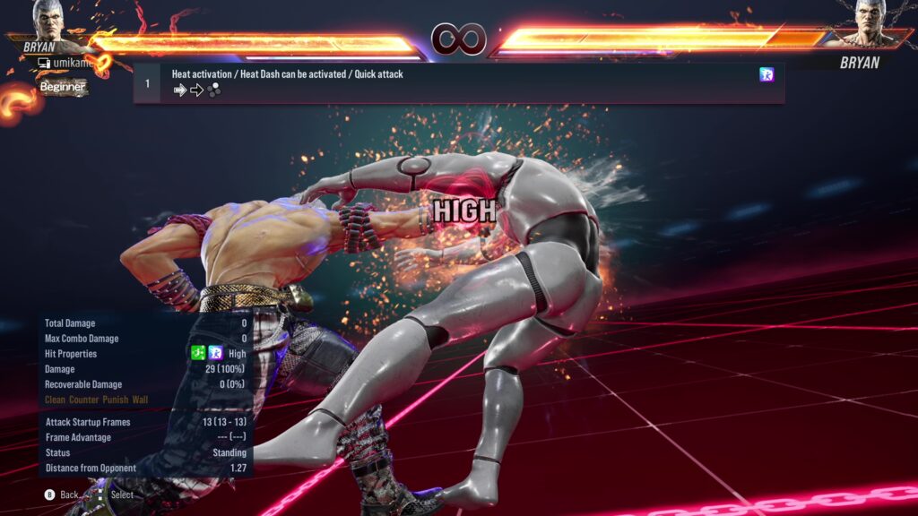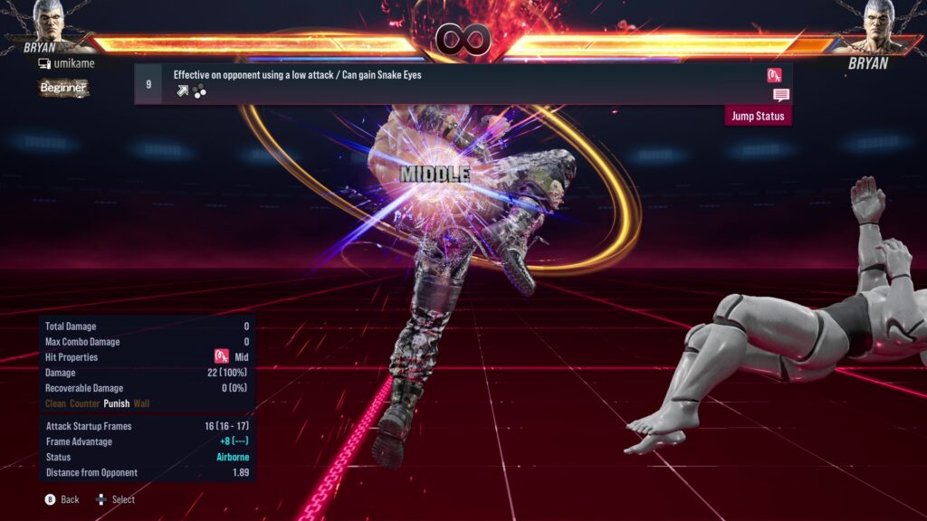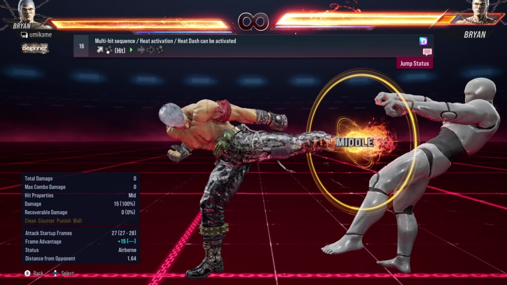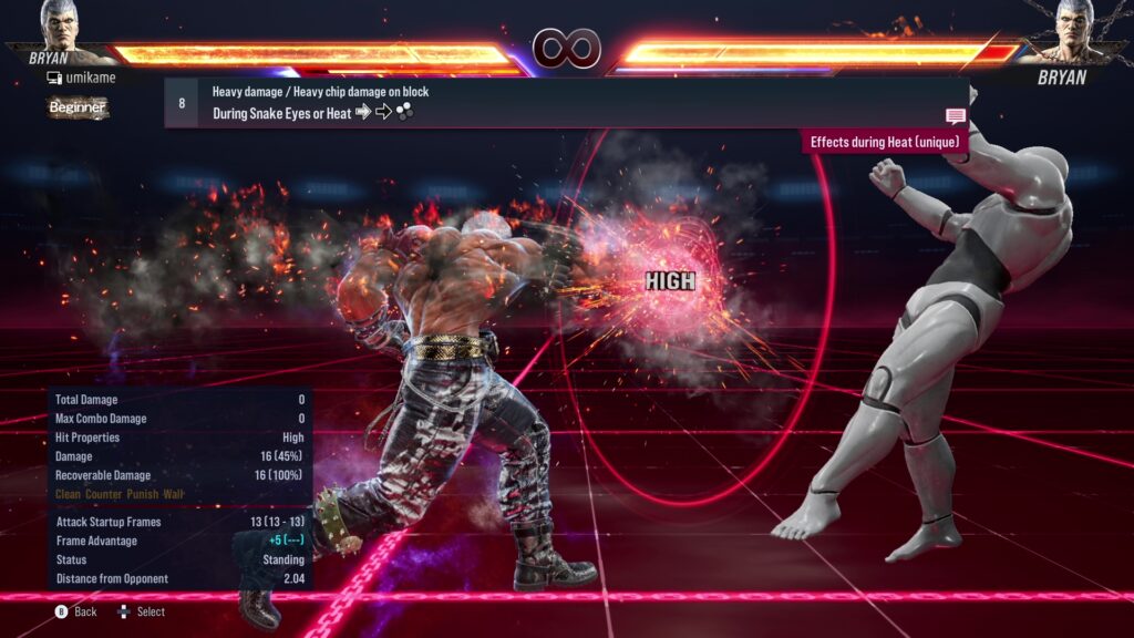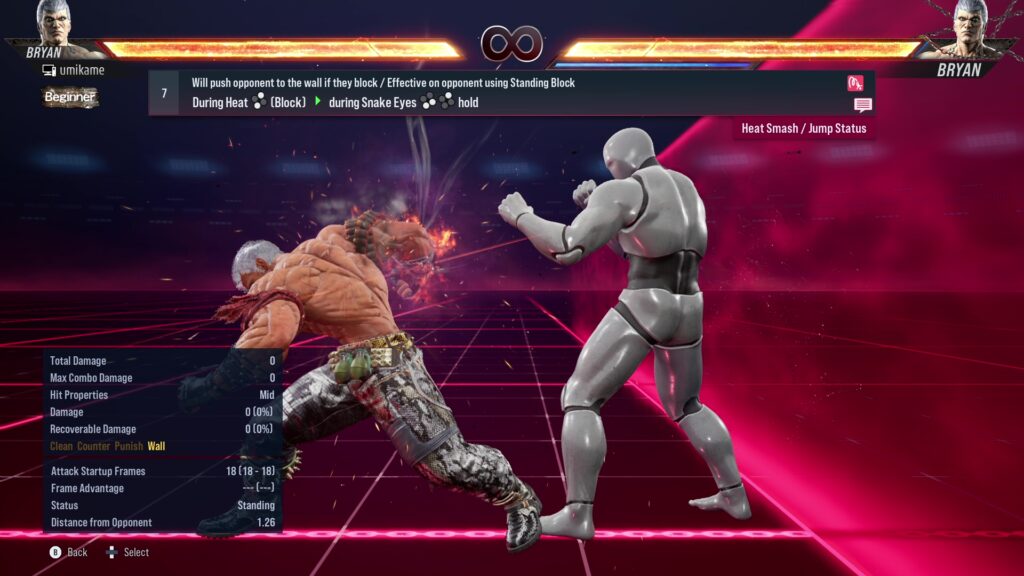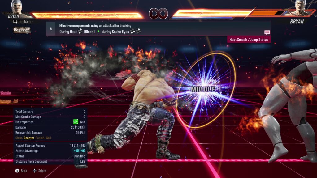 | During Heat 2+3〔Block〕→during Snake Eyes3+4,2hold | Heat Smash / Jump Status |