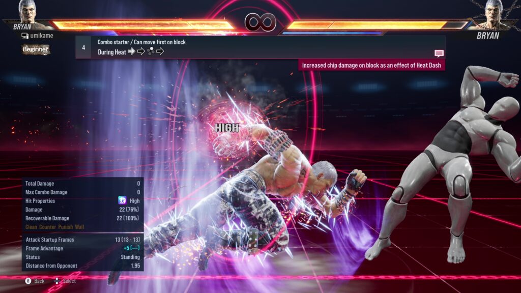 | During Heat ff+2,~f(HD)→uf+3+4 T!→3,3,4 | Combos that use Heat Dash |