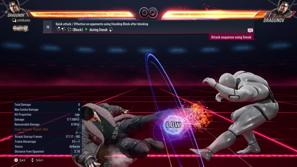 qcf+4〔Block〕→while crouching df+1,4〔CH〕→during Sneak 1+2 qcf+4 can move first on block