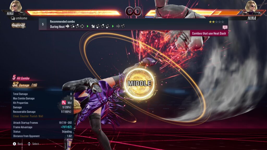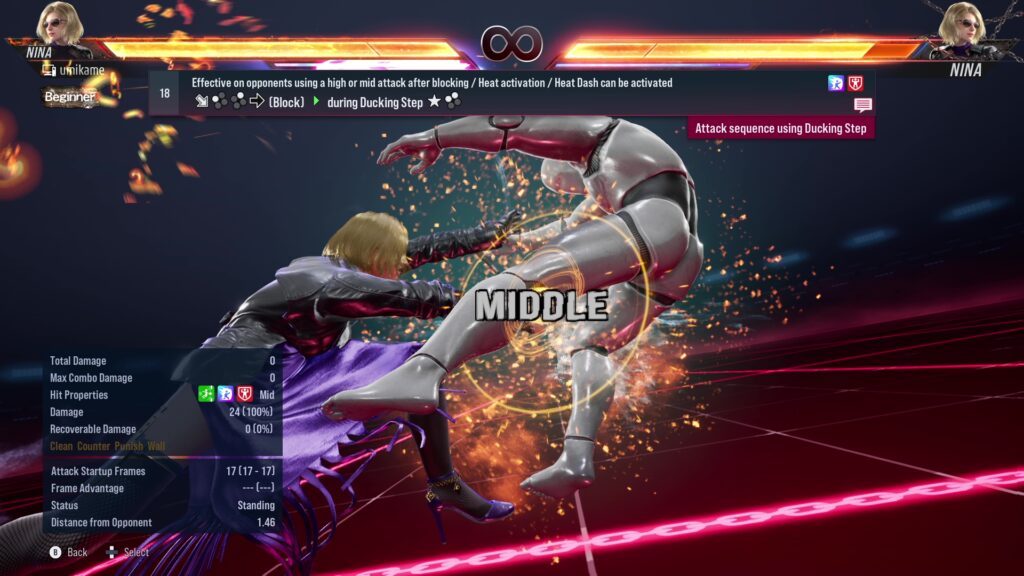 | During Heat 2+3,~f〔Block〕→during Ducking Step f+1 | Heat Smash / Attack sequence using Ducking Step |