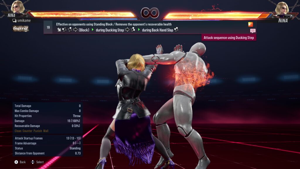| df+1,2,~f〔Block〕→during Ducking Step f+2+4→during Back Hand Slap 1+2 | Attack sequence using Ducking Step |