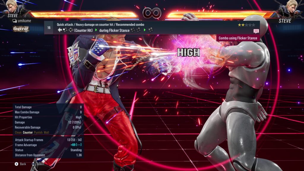 | b+1,~b〔CH〕→during Flicker Stance 1,2 T!→1+2 | Combo using Flicker Stance |