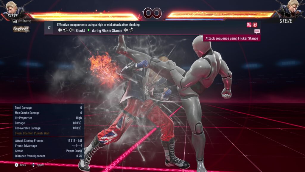 | b+1,~b〔Block〕→during Flicker Stance b+2 | Attack sequence using Flicker Stance |